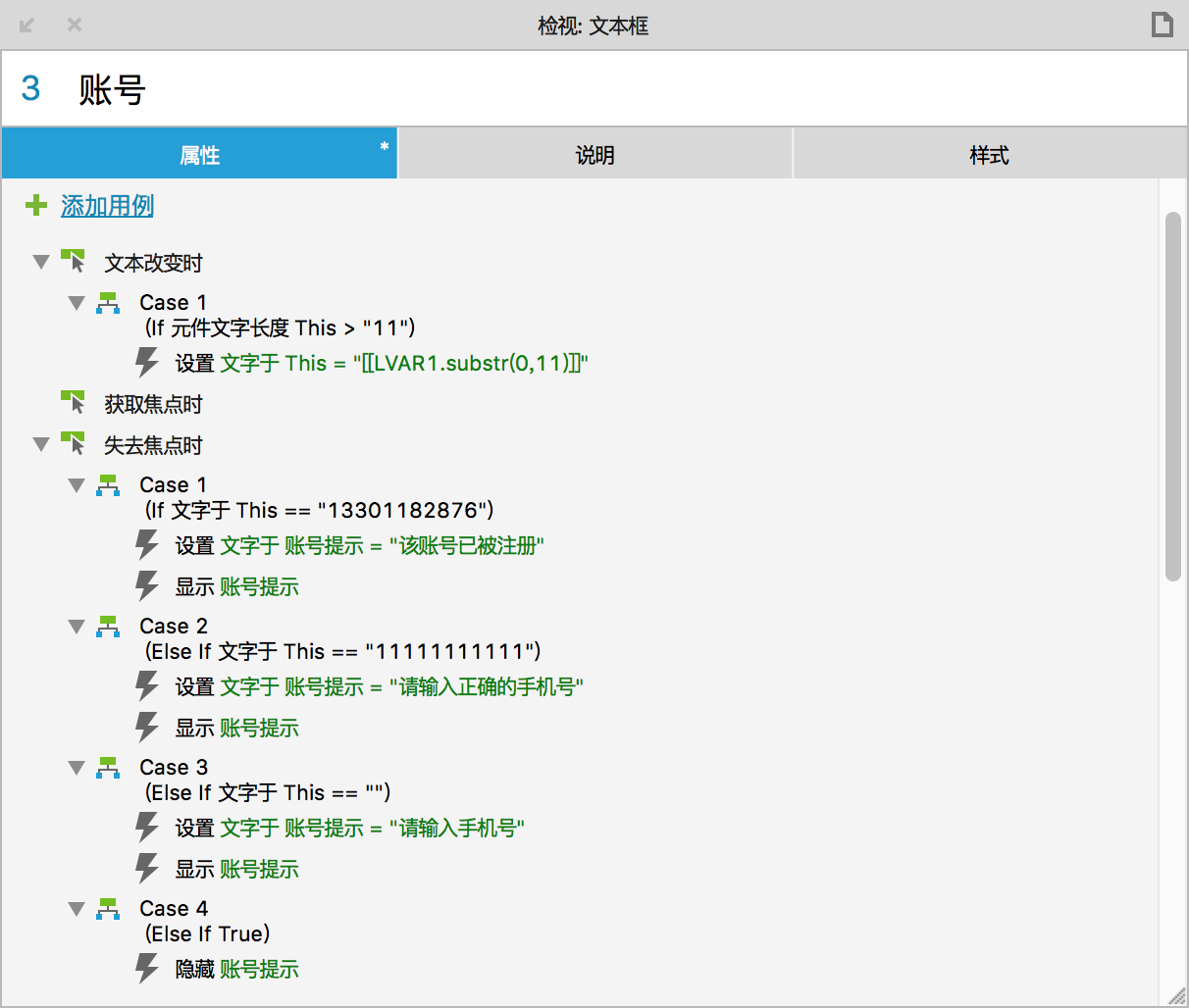 3. 交互思路分析 账号:通过文本改变事件限制账号输入框只能输入 11 位数字,即当账号文本框中的文字长度大于 11 位时,则账号文本框的值为=[[lvar1.substr(0,11)]],其中局部变量lvar1 为账号文本框的文字。函数表达式的意思为针对账号文本框的文字,从 0 位开始,截取前 11 位长度的字符串内容,原函数为substr(start,length)。