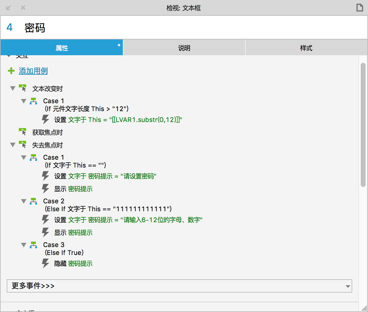 密码:通过文本改变事件限制密码输入框只能输入 12 位,即当密码文本框中的文字长度大于 12 位时,则密码文本框的值为=[[lvar1.substr(0,12)]],其中局部变量lvar1 为密码文本框的文字。函数的用法与解释请参照上文账号输入框的限制。