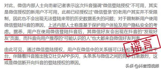 我们注意到今天有媒体报道称,“微信内部人士回应”:通过微信登录授权,用户在微信中的关系链可以被轻松复制到抖音平台。